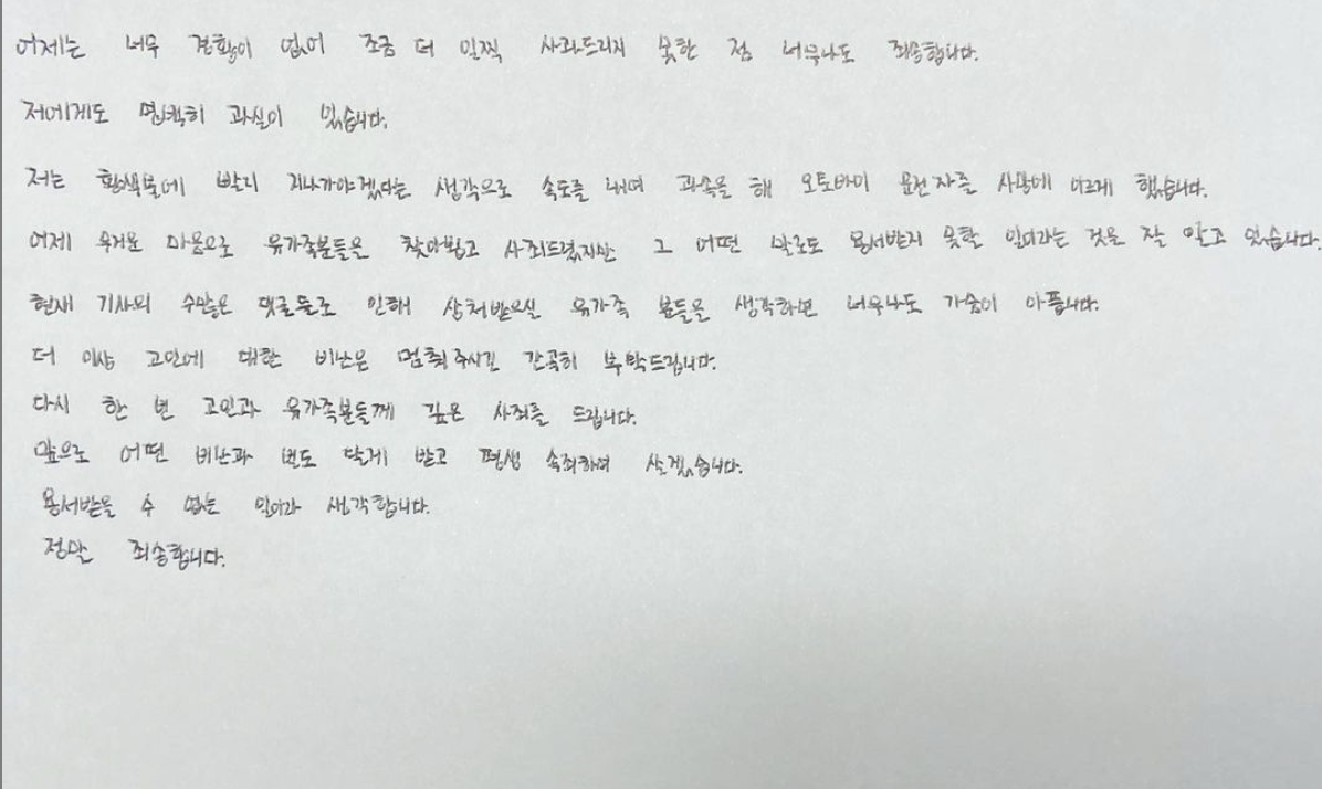 박신영 아나운서가 사과문을 인스타그램에 올렸다. 박신영 아나운서는 최근 운전 중에 오토바이와 교통사고가 발생해 오토바이 운전자가 사망하는 사고가 있었다. 현장에서 구호조치도 했지만 안타깝게도 사망하는 사고였는데 이에 대해 경찰조사도 받았고 어제는 소속사 입장으로 사과문을 올렸었다. 자필 사과문을 올리면서 사과를 다시한번 하였다.