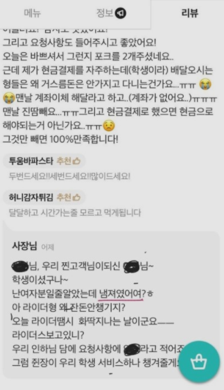 배민 빌런은 손님이 빌런인 경우도 있고 사장이 빌런인 경우도 있다. 손님이 빌런인 경우는 보통 말도안되는 이유로 별점테러를 주거나 서비스를 무리하게 요구하는 경우가 태반이다. 반대로 사장빌런은 말그대로 배짱장사를 하는 경우이다. 리뷰에 대한 답글에 막말을 하는 경우가 대부분이다.