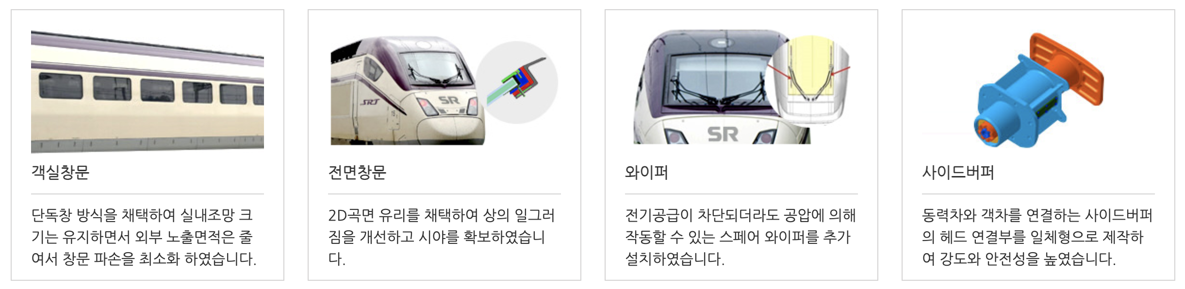 - SRT는 고객 안전을 위해 객실 창 구조 개선, 승하차 손잡이 및 승강문 발판 개선, 열ㆍ연기를 동시에 감지할 수 있는 화재경보장치 장착 등 안전설비를 대폭 강화했습니다.