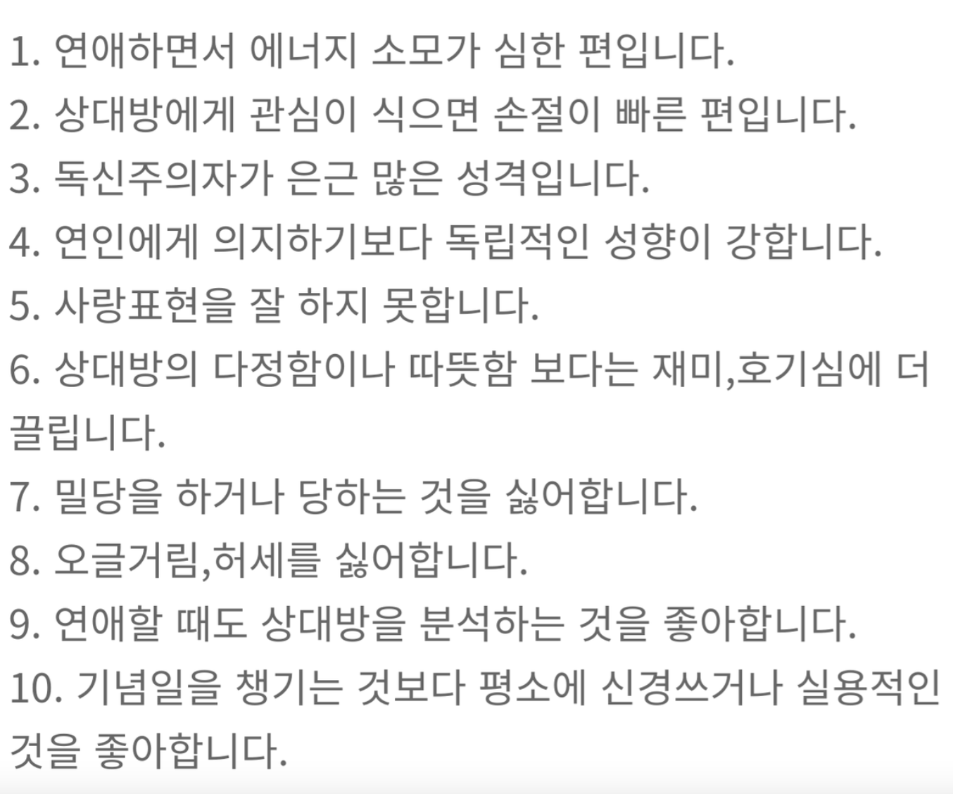 1번은 어디간다 뭐할거다 부터 세세하게 말하는편 2 관심이 없는거보다 그냥 애인이랑 보면 뭘하든 좋음 그냥 계획 세우는게 너무 힘듬 3 사람자체가 수동태 그자체라 하자는건 다해주는데 주도적으로 하라고 하면 어려움 그래도 애인 사랑은 했음